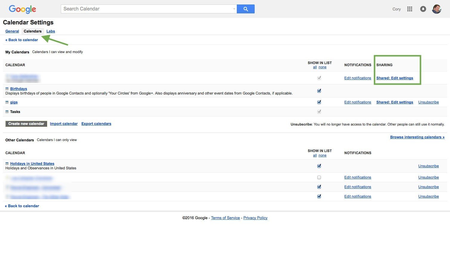 - Go into the sharing settings and give your primary account full management rights (the account you want all the events to show up in)